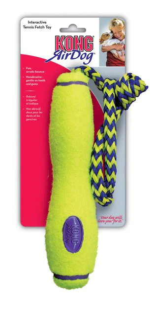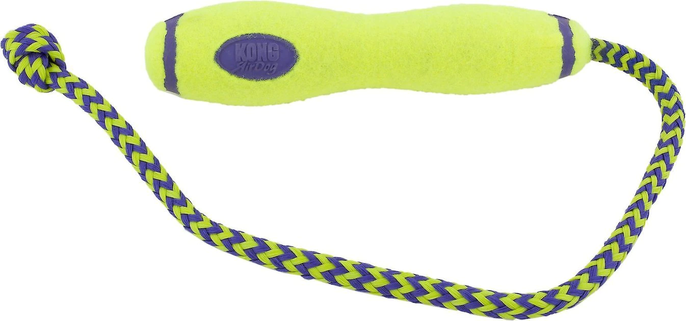 The KONG AirDog Fetch Stick w/ Rope floats high on the water and comes with a high-quality throw rope. Its made from nonabrasive tennis ball material, which is gentle on teeth and gums. This toy is perfect for the dog that loves to swim and fetch.