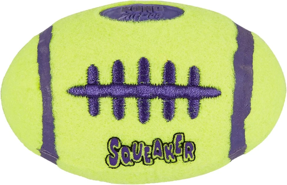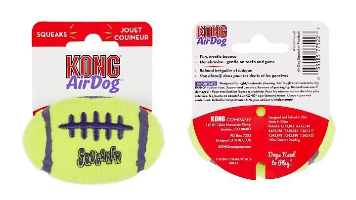 The KONG AirDog Football combines two classic dog toys — the tennis ball and the squeaker toy — to create an instantly recognizable football shape that’s the perfect fetch toy. This durable, high-quality AirDog Football will not wear down a dog’s teeth. It’s made with a special nonabrasive felt, compared to the abrasive material on normal tennis balls.