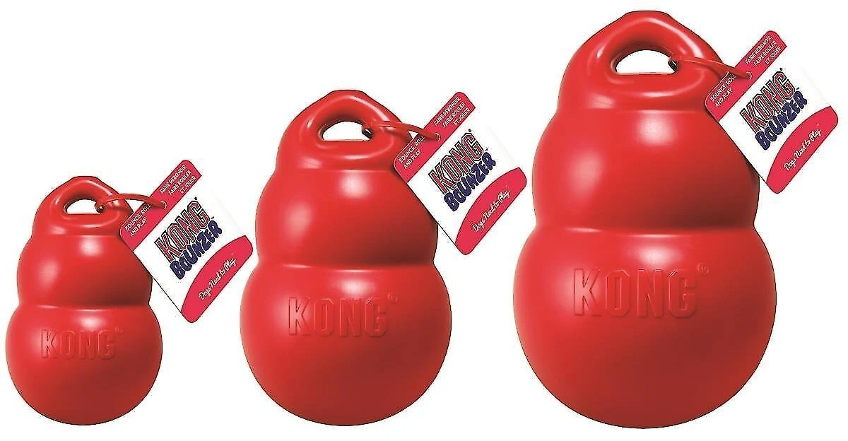 Dogs will go crazy for the KONG Bounzer! Made in the classic KONG silhouette, the Bounzer compresses when grabbed by the dog, releasing air from the toy and encouraging self-play. And, it bounces right back to its original shape! The handle on top of this toy makes it easy to throw during fetch or handle for tug-o-war. Your dog will love to bounce, roll and play with these oversized, KONG-shaped toys!