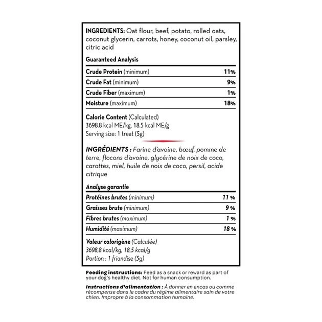 Oat Flour, Beef, Potato, Rolled Oats, Coconut Glycerin, Carrots, Honey, Coconut Oil, Parsley, Citric Acid