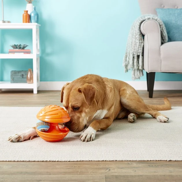 For a perplexing challenge, introduce your dog to the Rambler from KONG. This unique game combines two toys into one. While the outer ball squeaks and entices, the inner tennis ball rolls along the track. This unpredictable movement and noise will puzzle your pup, creating an action-packed, interactive play session sure to get those gears turning. Ideal for solo or interactive play, the Rambler will bring the fun and the challenge straight to your pup’s jaws.