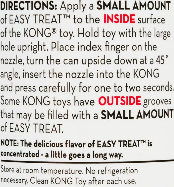 Apply a SMALL AMOUNT of EASY TREAT to the INSIDE surface of the KONG toy. Hold toy with the large hole upright. Place index finger on the n ozzle, turn the can upside down at a 45 angle, insert the n ozzle into the KONG and press carefully for 1 – 2 seconds. Some KONG toys have OUTSIDE grooves that may be filled with a SMALL AMOUNT of EASY TREAT.