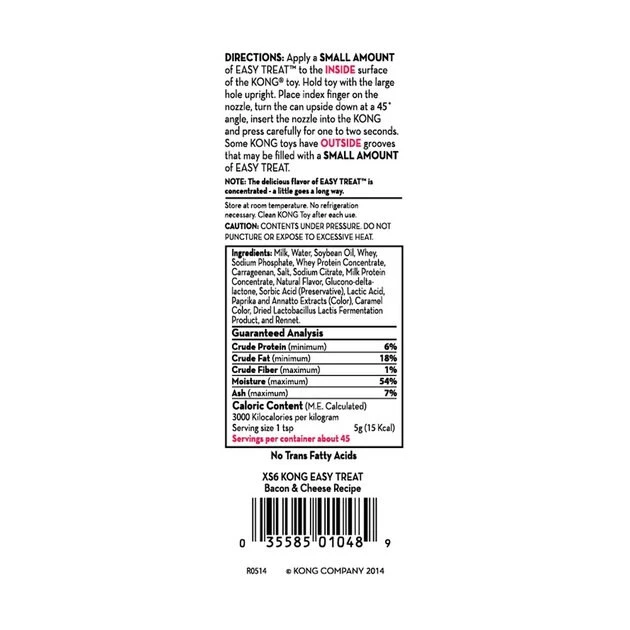 Playtime with your pal is now mess-free, hassle-free, and only a delicious dab away with the irresistible bacon and cheese flavor of the KONG Stuff’N Easy Treat Bacon & Cheese Recipe. With an easy-to-use, built-in nozzle, simply tilt and press to reward your best pal with a delectable treat anytime, or easily fill any KONG rubber toy for extended playtime. Your dog will love the delicious bacon and cheese flavor and lip-smacking texture! While he spends hours licking and savoring his favorite treat-stuffed KONG toy, you can feel good about providing a delicious, trans-fat free, highly-digestible reward. Freeze inside a KONG rubber toy for a longer-lasting, mentally-stimulating challenge.